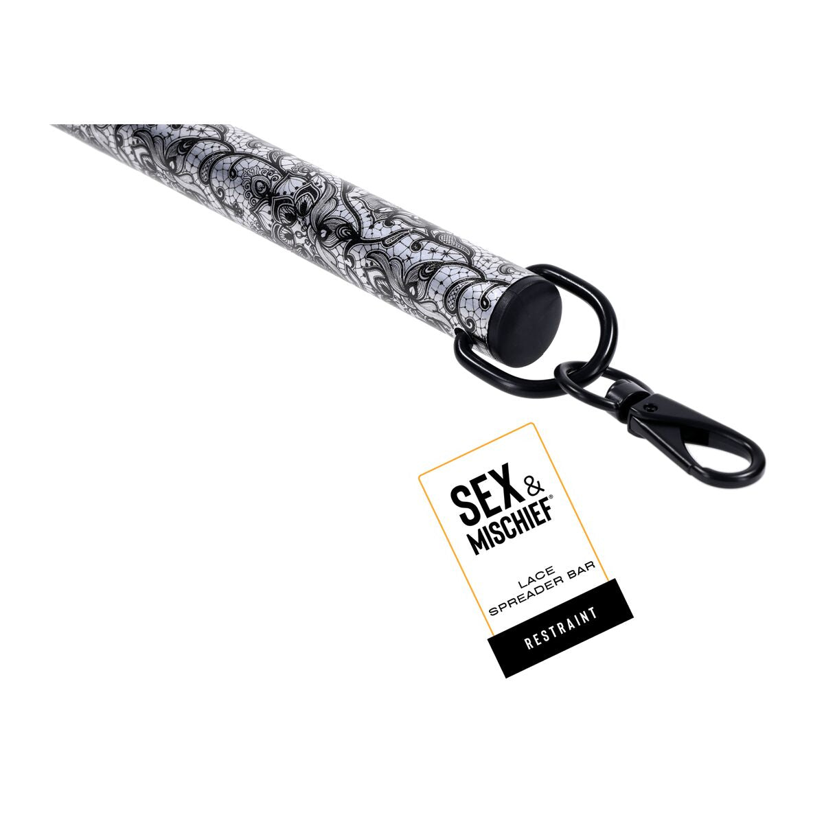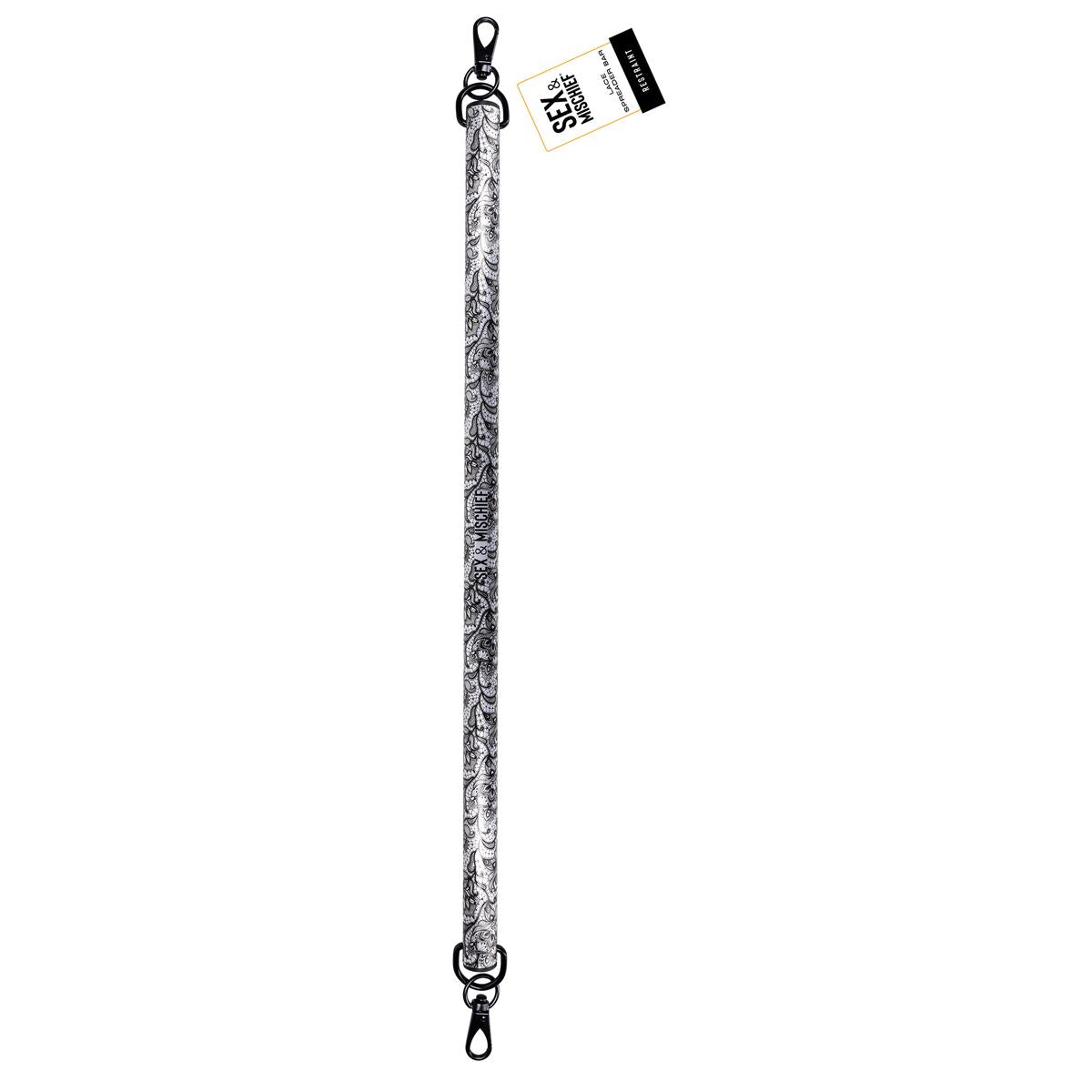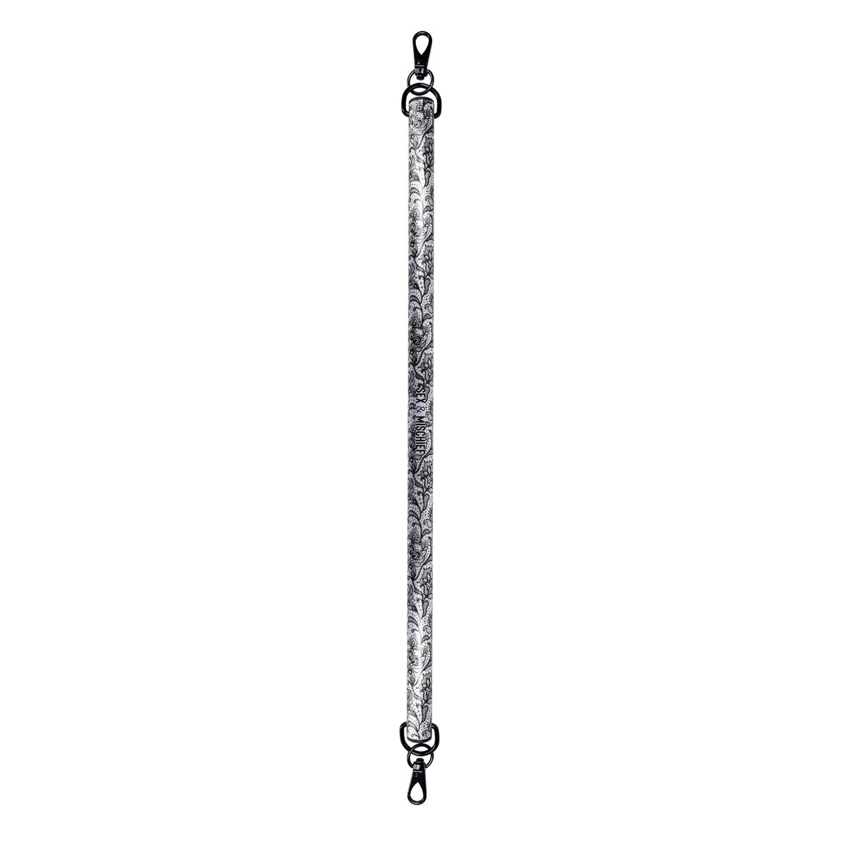 Indulge in the perfect blend of sophistication and seduction with this sultry metal spreader bar, adorned with an elegant black lace-etched design. The intricate detailing adds a sexy, refined edge, transforming restraint into an art form. Designed for both style and function, this spreader bar features sleek black clasps on each end, ensuring a quick and secure connection for effortless play. Whether you're exploring new levels of control or enhancing your intimate moments, this sensual yet sophisticated piece is crafted to captivate, tempt, and tease.